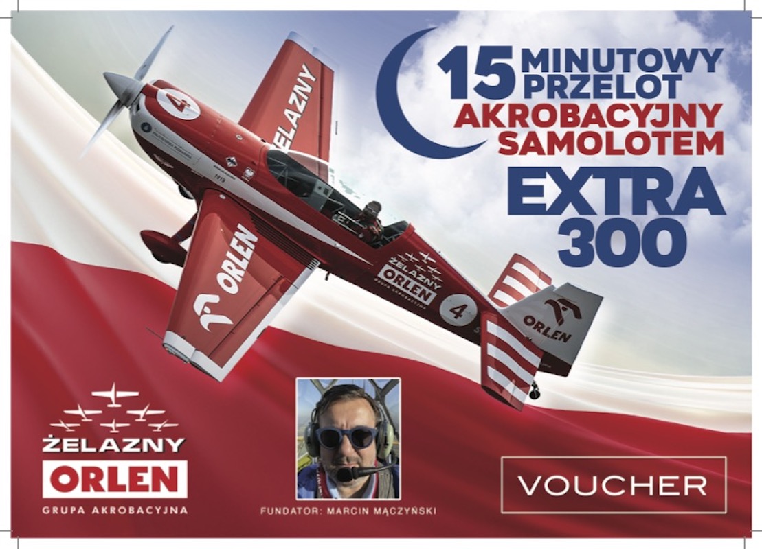 Wśród kilkunastu przedmiotów licytacji będzie voucher na 15-minutowy przelot akrobacyjny samolotem Extra 300 z pilotem z Grupy Akrobacyjnej Żelazny, ufundowany przez Marcina Mączyńskiego, sekretarza generalnego Izby Gospodarczej Hotelarstwa Polskiego.