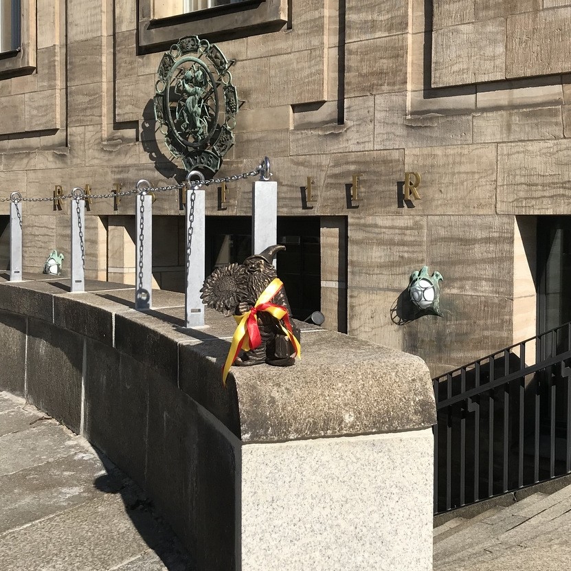 Wrocławski Krasnal stanie w Dreźnie – przy Ratuszu, przed restauracją Ratskeller