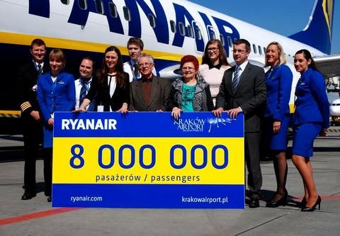 Ryanair, ogłosił 21. maja, że od 2005 roku przewiozła 8 milionów pasażerów z/do Krakowa. 8 milionowym pasażerem Ryanair’a w Krakowie była Joanna Sroga. Pani Joanna podróżowała z Krakowa do Brukseli z mężem Ryszardem do wnuczki na komunię.
