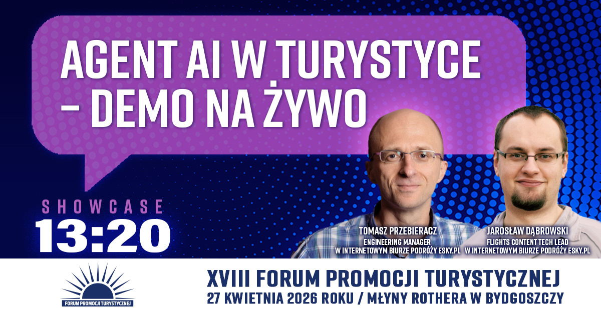 Działanie agenti AI w praktyce zaprezentują Tomasz Przebieracz i Jarosław Dąbrowski z eSky.pl. Firma od lat rozwija segment dynamicznie pakietowanych podróży oraz stawia na narzędzia online, które wspierają sprzedaż usług turystycznych.