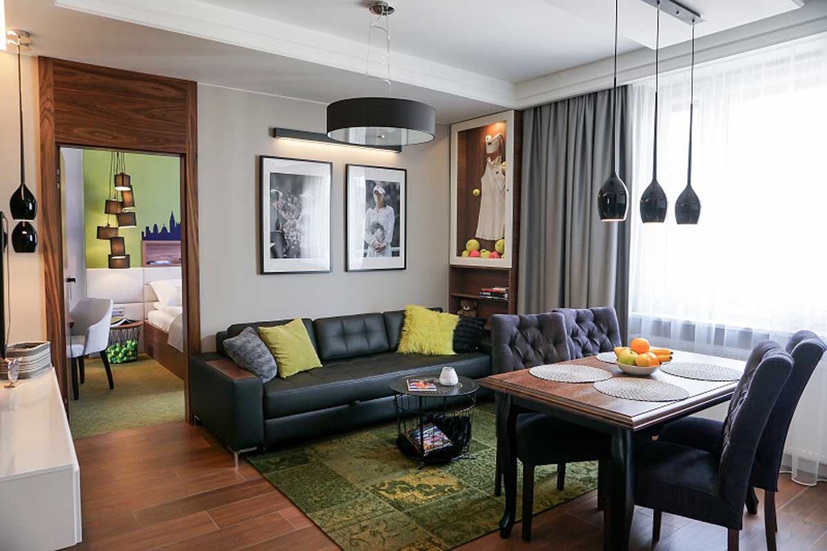 Oryginalny tenisowy wystrój wzbogacony jest o wielkoformatowe fotografie Agnieszki Radwańskiej z turniejów, piłeczki tenisowe czy elementy nawiązujące swoim stylem i charakterem do miast, w których rozgrywane są turnieje. Widoczny na powyższym zdjęciu apartament Wimbledon nie bez powodu łączy kolory biały i zielony. Fani tenisa doskonale wiedzą, że Wimbledon to zielone korty trawiaste i tradycyjnie białe stroje wszystkich tenisistów biorących udział w tym wspaniałym sportowym wydarzeniu.