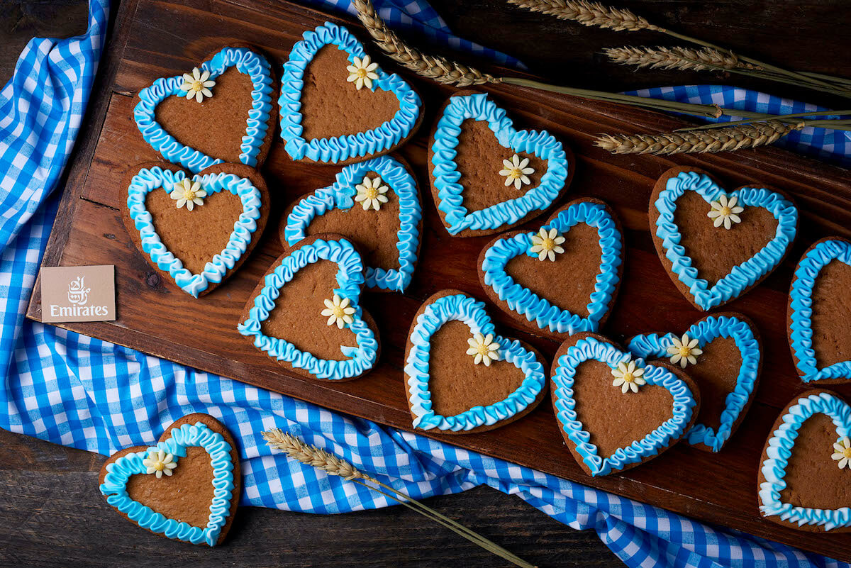 Kultowy salon pokładowy Emirates A380, dostępny dla pasażerów podróżujących klasą pierwszą i biznes, będzie oferował całą gamę przekąsek inspirowanych Bawarią, będą to m.in. kanapki z serem ementaler z korniszonami, mini precle z tradycyjnymi dipami, takimi jak obatzda, bawarskie ciastka, a także małe serduszka z piernika, którymi można podzielić się z ukochaną osobą.