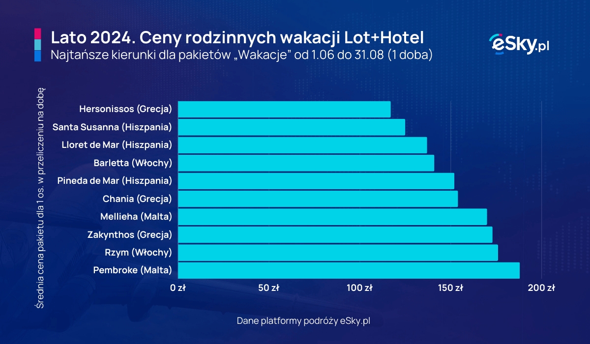 Co piąta rodzina (18 proc.), która rezerwuje wakacje w opcji lot plus hotel na eSky.pl, w sezonie letnim 2024 stawia na Grecję. Korfu, Rodos, Zakynthos oraz Kreta to kierunki, gdzie Polacy najchętniej udadzą się ze swoimi dziećmi. Na tle obleganych latem wysp szczególnie wyróżniają się miasta Hersonissos i Chania na Krecie, gdzie odpowiednio 6- i 10-dniowy wypoczynek dla jednej osoby kosztuje kolejno 700 zł i 1 540 zł za przelot z noclegami w pakiecie.