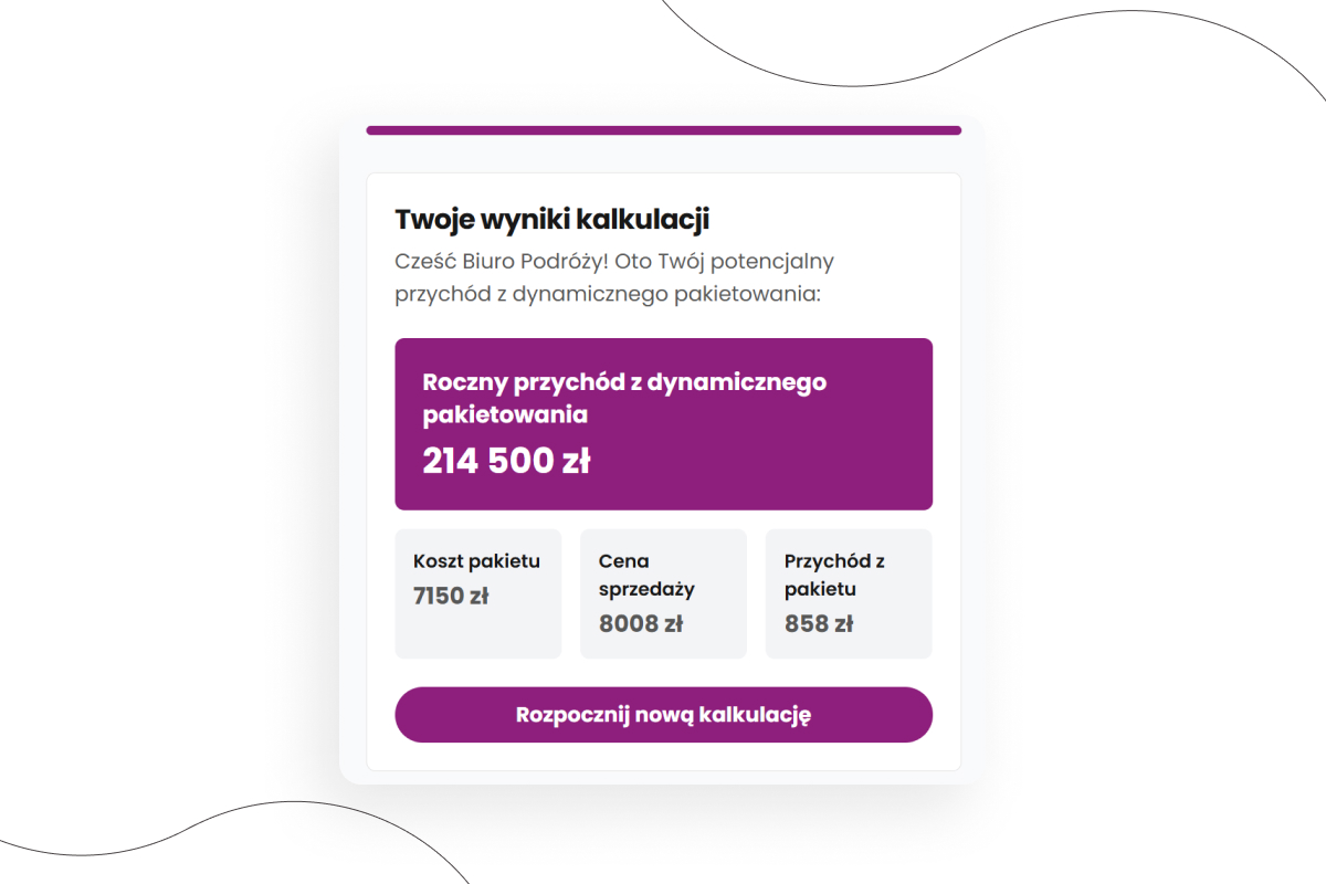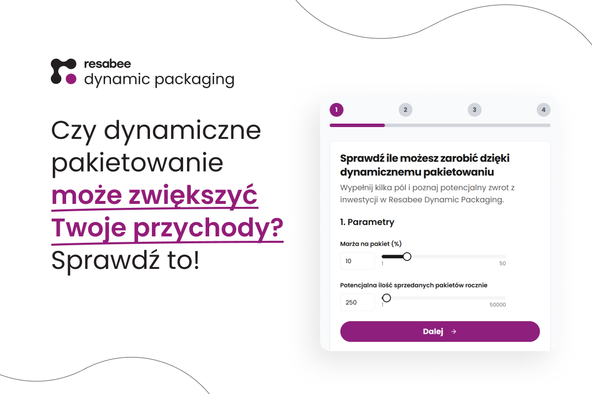 Chcesz dowiedzieć się, jak dynamiczne pakietowanie może wpłynąć na Twoją sprzedaż? Skorzystaj z naszego kalkulatora Resabee Dynamic Packaging i poznaj prognozowany przychód.