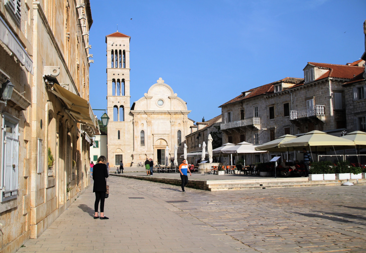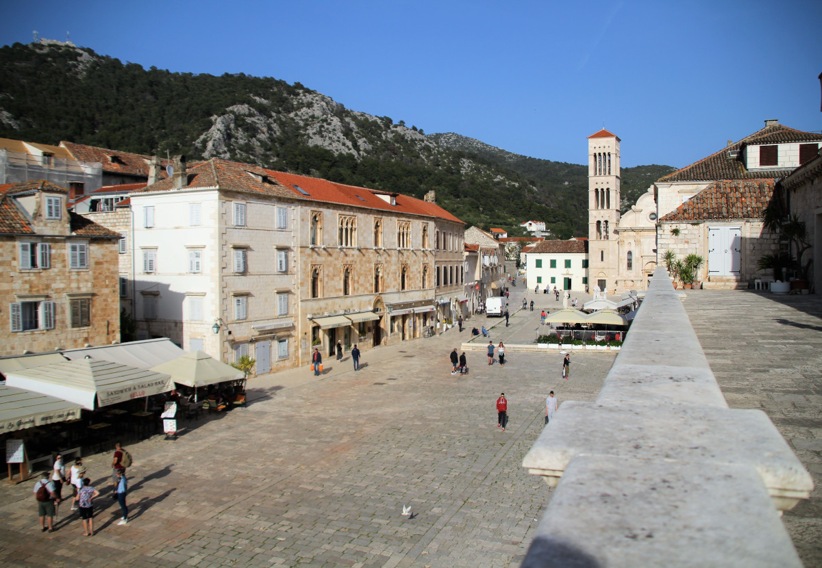 Pierwszy dzień w mieście warto przeznaczyć na spacer po starówce. Możemy obejrzeć XVII-wieczny teatr – najstarszy na świecie taki przybytek udostępniony szerokiej publiczności. Obecnie na ukończeniu jest remont wnętrz, trwający tu od pięciu lat. Aby zajrzeć do środka, musimy dostać się na pierwsze piętro budynku Arsenału – z tarasu mamy piękny widok na górującą nad miastem twierdzę Spanjolę, zbudowaną w XVI wieku, za czasów weneckich. Widzimy też największy plac w Dalmacji – Hvarska pjaca, który był niegdyś fosą oddzielającą dzielnicę szlachecką od domów biedoty.