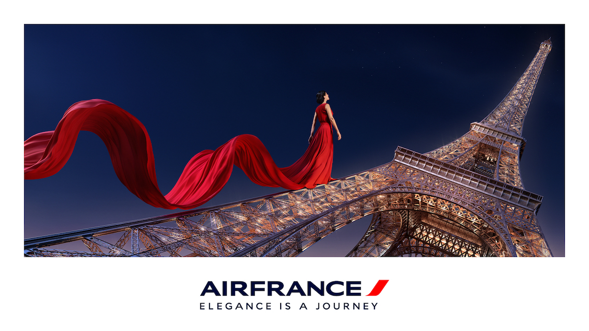 Jedna z głównych kreacji przedstawia modelkę w czerwonej wieczorowej sukni wspinającą się na wieżę Eiffla. Ogromny wizual zdobi fasadę siedziby Air France na lotnisku Charles de Gaulle w Paryżu, dzięki czemu jest doskonale widoczny zarówno z dróg, terminali, jak i z płyty lotniska. Ten sam spot w formacie wideo 3D wykorzystywany jest jednocześnie na nośnikach outdoorowych i platformach cyfrowych.