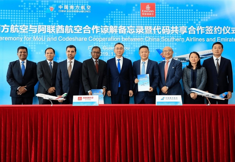 Linie Emirates i China Southern Airlines podpisały list intencyjny w sprawie zawarcia obszernego porozumienia code-share, które ma wprowadzić nowe kierunki dla pasażerów podróżujących z Chin na Bliski Wschód i do Afryki. Ponadto współpraca z kantońskimi liniami pozwoli pasażerom Emirates korzystać z oferty dogodnych połączeń krajowych na terytorium Chin.
