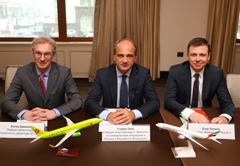 Emirates i S7 Airlines współpracują ze sobą od 2003 roku, a w 2008 roku rozszerzyły dwustronną umowę. Nowe porozumienie code-share oparte jest na silnym partnerstwie między przewoźnikami, a w jego ramach do siatki Emirates dołączy 30 nowych tras obsługiwanych przez S7 Airlines na terytorium całej Rosji oraz połączenie S7 z Dubaju do Nowosybirska, realizowane dwa razy w tygodniu. Ponadto w ramach umowy kod linii S7 znajdzie się w numerze lotu z Dubaju do Moskwy, obsługiwanego przez Emirates.