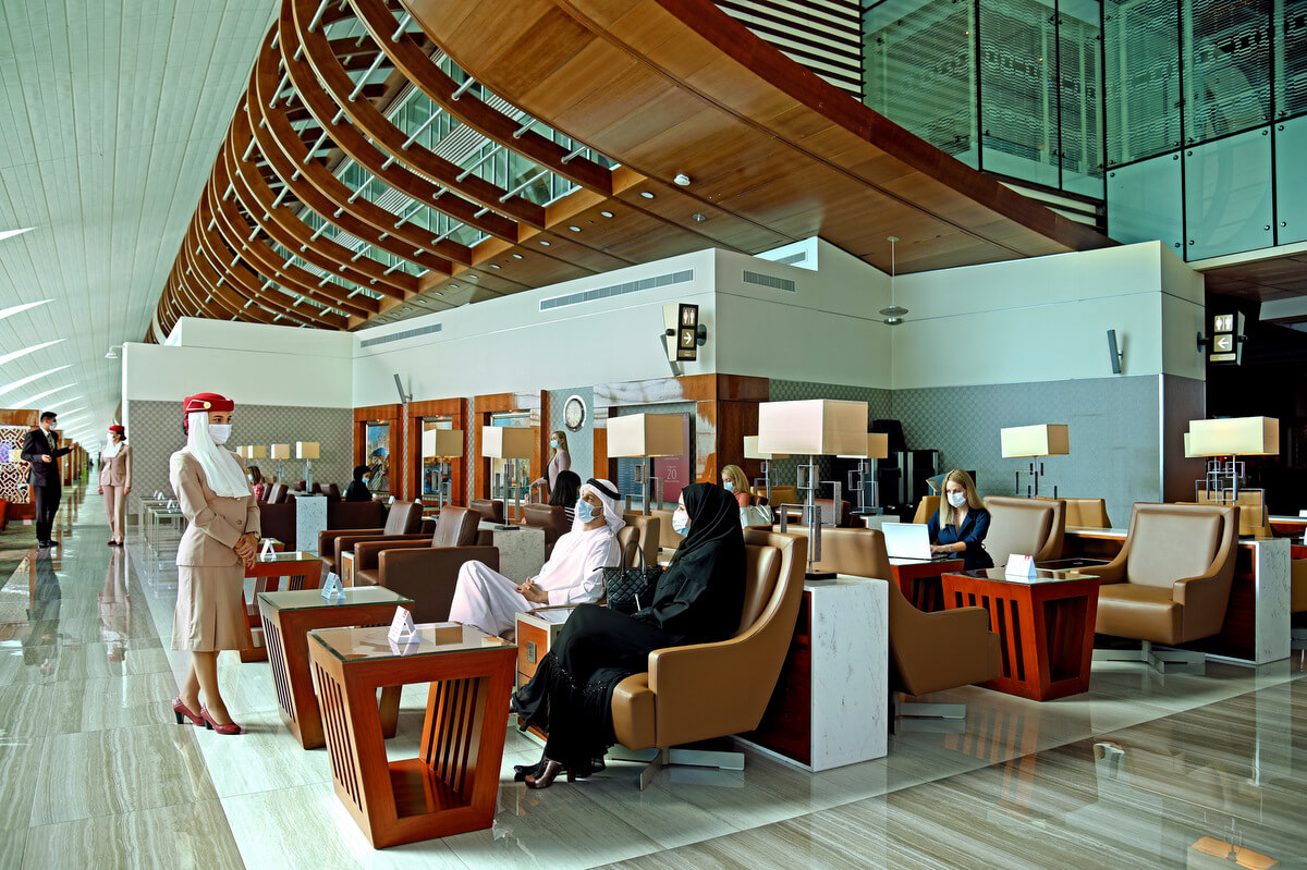 Poczekalnia klasy biznes w hali B w Dubaju zapewnia wysoki komfort i obsługę pasażerom premium. Dzięki wdrożonym środkom bezpieczeństwa klienci mogą się zrelaksować, delektować światowymi smakami i nadrobić zaległości przed wejściem na następny lot. Poczekalnia Emirates Business Class w Terminalu 3 na Międzynarodowym Porcie Lotniczym w Dubaju również stopniowo wprowadzała swoją słynną ofertę dostępną przed pandemią, w tym między innymi kompleksowe usługi gastronomiczne czy ciche strefy.