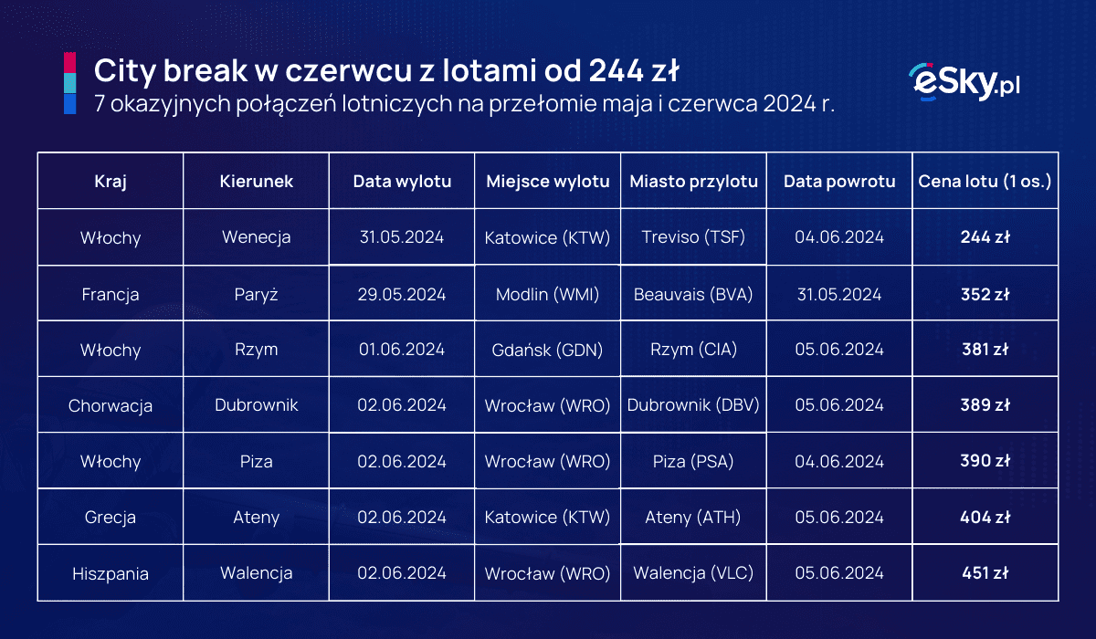 Listę najtańszych kierunków obejmujących podróż samolotem z wylotem w dniach 30 maja – 2 czerwca 2024 r. przygotowano na podstawie opcji lotów tam i z powrotem zaprezentowanych w kolekcji „Czerwcowy długi weekend w mieście” na stronie „Okazje” eSky.pl. Ceny biletów są aktualne w dniu 18 marca 2024 roku i mogą się zmieniać, co jest efektem stosowania dynamicznego cennika przez linie lotnicze.
