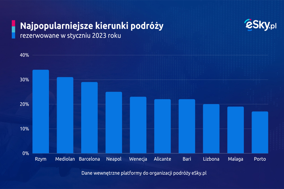Polacy w styczniu najczęściej rezerwowali wyjazdy w obrębie Europy, a największą popularnością cieszyły się Włochy. Do kraju, gdzie można poczuć „dolce vita”, polscy podróżnicy najczęściej wybierają wyjazdy w okresie długich weekendów, ale także w przeddzień wakacji – w czerwcu. Do najpopularniejszych miejsc zalicza się Rzym, Mediolan, Wenecja, Bari oraz Neapol. Tuż za Włochami uplasowała się Hiszpania. Top pięć miejsc w Hiszpanii, które rezerwowano w serwisie eSky.pl to między innymi Barcelona, Malaga, Alicante.