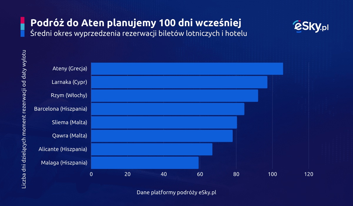 W kwietniu i maju słupek rtęci na Cyprze osiąga 20-25 stopni Celsjusza, a liczba dni słonecznych w ciągu miesiąca wynosi 30. Z racji dobrych warunków na city break 7 proc. Polaków podróżujących z eSky.pl poleci do południowej Larnaki. Za przelot i kilkudniowy pobyt w 3‑gwiazdkowych hotelach bez posiłków – bo na takie decydują się tu najczęściej – płacą 800 zł od osoby.