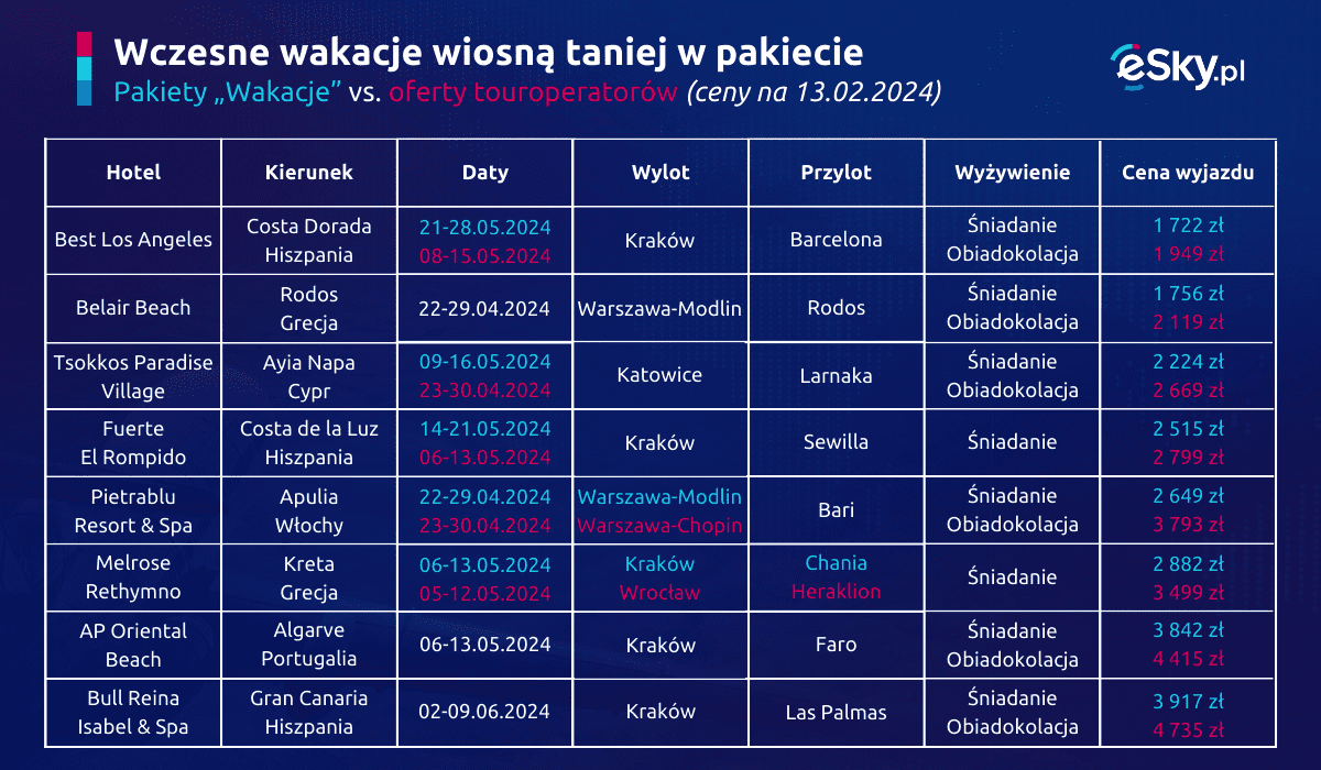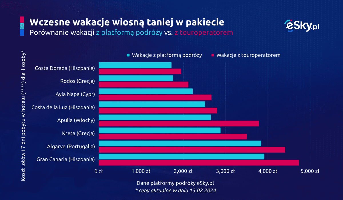 Wakacje przed sezonem zorganizowane z pomocą internetowych platform podróży mogą kosztować do jednej trzecią taniej niż oferta u touroperatora. Przykładowo za tygodniowy urlop w Apulii we Włoszech jedna osoba zapłaci o 1,1 tys. zł mniej, a na Wyspach Kanaryjskich – o 800 zł. I to z lotami w obie strony oraz hotelem z wyżywieniem w pakiecie. Platforma podróży eSky.pl wprowadza na polski rynek „Gwarancję Najniższej Ceny” i obejmuje nią całą ofertę pakietową w opcji lot plus hotel.