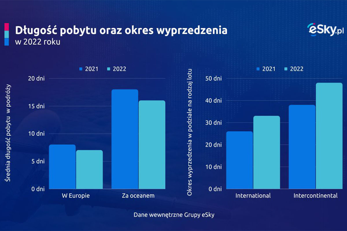 W ubiegłym roku Polacy rezerwowali podróże lotnicze z większym niż w 2020 oraz 2021 roku wyprzedzeniem. W przypadku lotów typu international tj. w obrębie Europy średni okres wyprzedzenia wyniósł około 33 dni – jest to wzrost względem 2021 roku o tydzień. Jeśli chodzi o loty międzykontynentalne, to okres wyprzedzenia oscylował na poziomie 48 dni, co daje wzrost o ponad półtora tygodnia niż w 2021 roku.