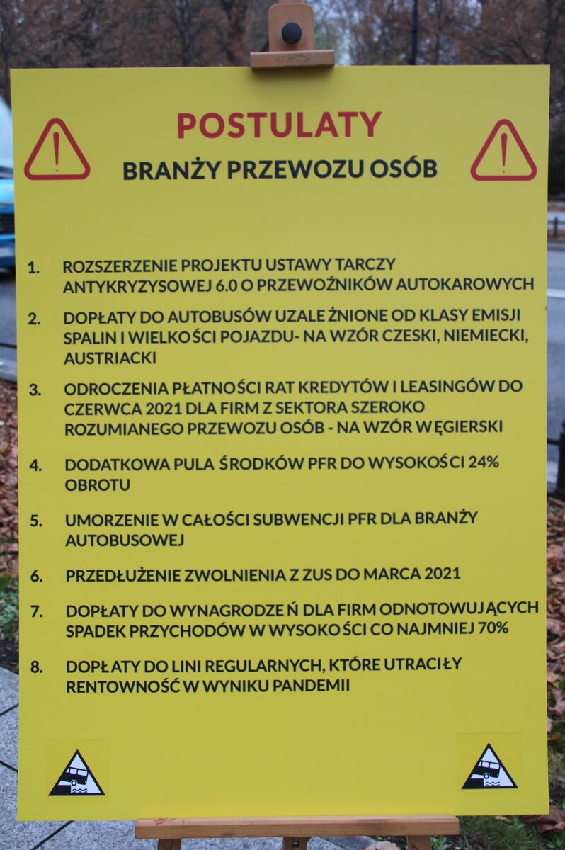 Osiem postulatów, w tym żądanie żądanie rozszerzenia projektu ustawy o tarczy antykryzysowej 6.0 o przewoźników autokarowych, przedstawiają przewoźnicy autokarowi protestujący po raz kolejny na ulicach największych miast w Polsce.