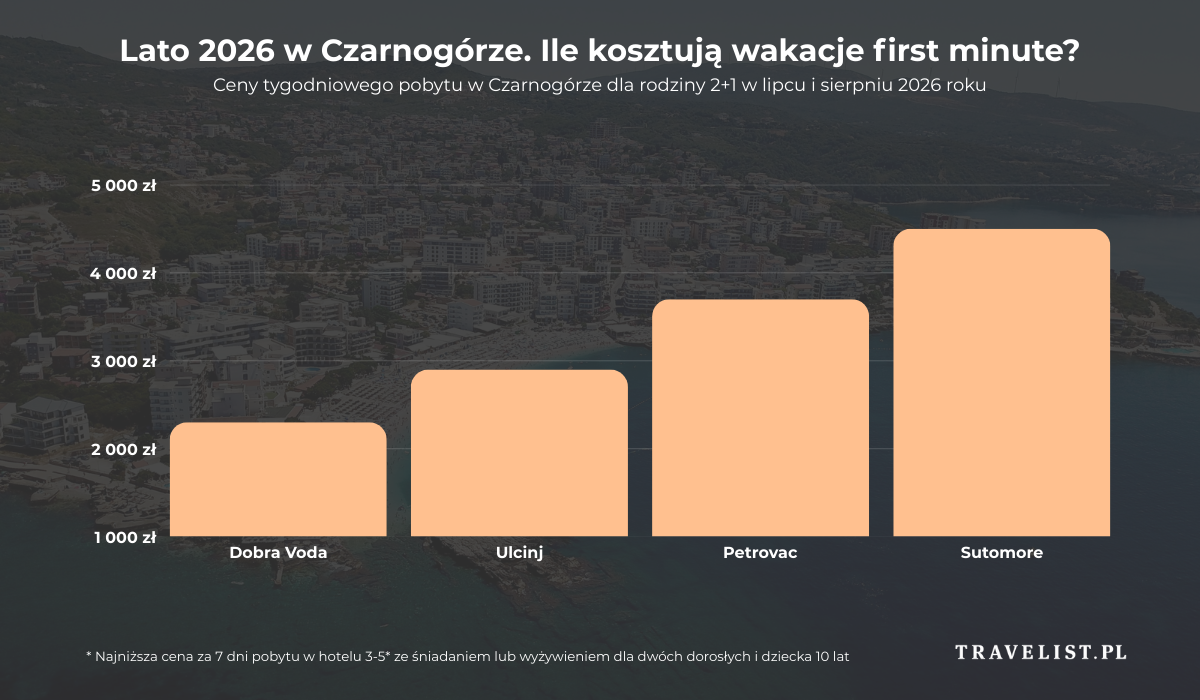 Planując rodzinne wakacje nad Adriatykiem, coraz więcej osób zwraca uwagę na Czarnogórę. To kierunek, który wyróżnia się bardzo korzystnym stosunkiem jakości do ceny, szczególnie w środku sezonu. Na Riwierze Budvańskiej popularnością cieszy się m.in. Petrovac – spokojna i kameralna miejscowość z zadbaną promenadą i mniejszymi plażami, sprzyjającymi wypoczynkowi z dziećmi. W lipcu i sierpniu tygodniowy pobyt z wyżywieniem dla rodziny 2+1 można tu znaleźć już od około 3,7 tys. zł.