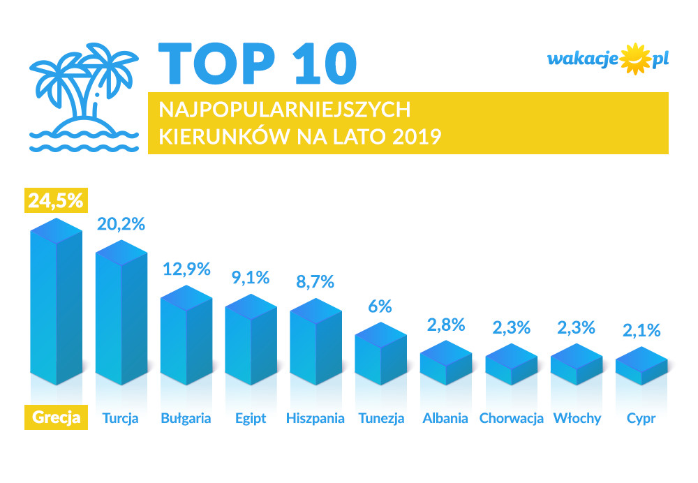 Najczęściej wybieranym przez Polaków kierunkiem na zagraniczne wakacje w lecie 2019 jest, podobnie jak w poprzednich kilku latach, Grecja. Choć eksperci branży turystycznej przewidywali, że w tym sezonie o miano lidera sprzedaży może z powodzeniem powalczyć Turcja, jak na razie w czołowej letniej piątce mamy status quo*. Według autorów raportu można bez większego ryzyka stwierdzić, że grecko-turecka rywalizacja o turystę zdominuje rynek. Jeden bądź drugi kraj wschodniej części basenu Morza Śródziemniego wybrało na letnie wakacje aż 45 proc. rezerwujących.