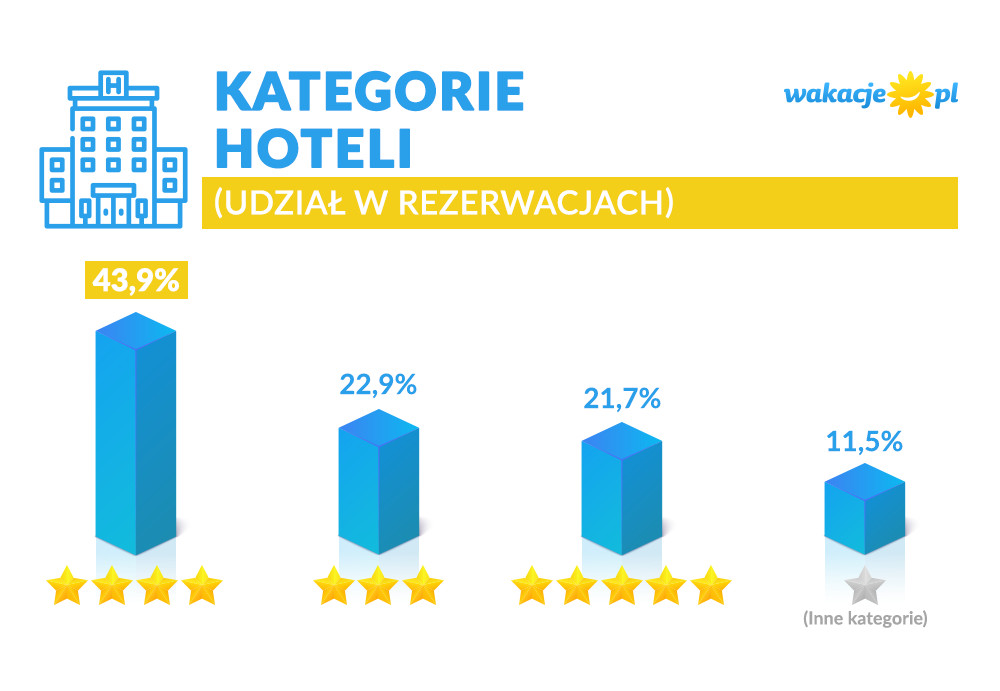 Wypoczywać będziemy przede wszystkim w hotelach 4-gwiazdkowych – wakacje w obiektach tej kategorii wybrało 43,9 proc. rezerwujących. Bardzo podobne udziały w rezerwacjach mają hotele z trzema i pięcioma gwiazdkami przy nazwie.