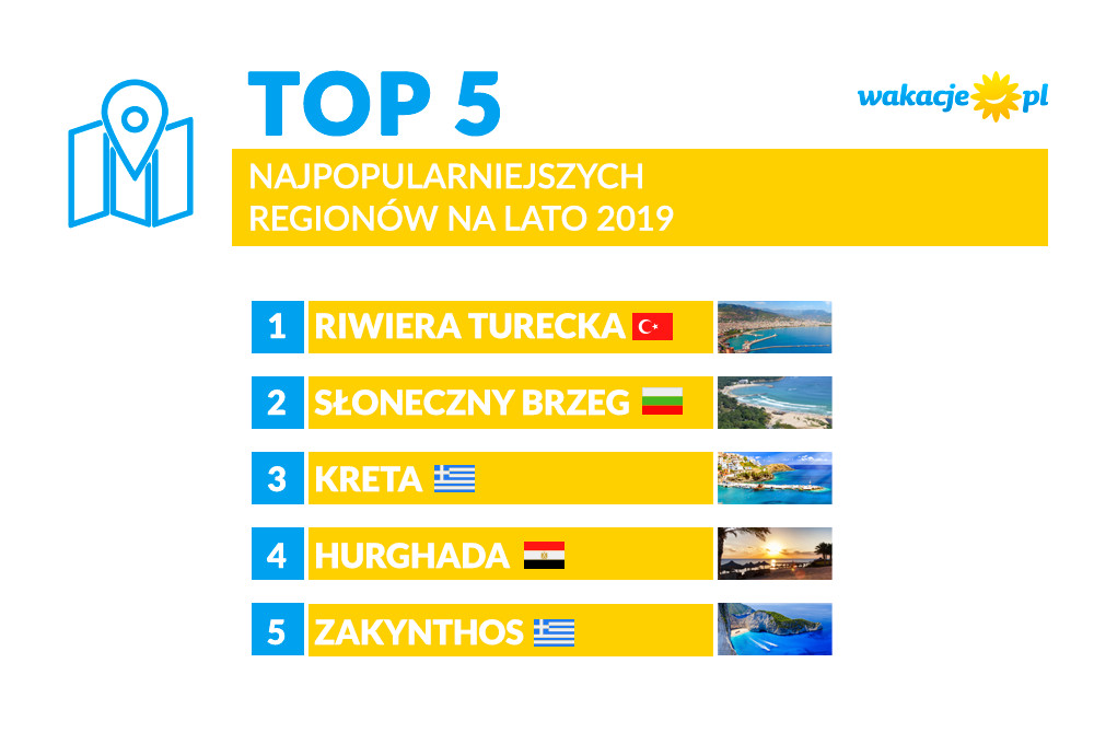 W klasyfikacji najpopularniejszych regionów wakacyjnych zdecydowanie zwycięża Riwiera Turecka, z kurortami takimi jak Alanya, Antalya czy Side. Na podium uplasowały się jeszcze bułgarski Słoneczny Brzeg i grecka Kreta.