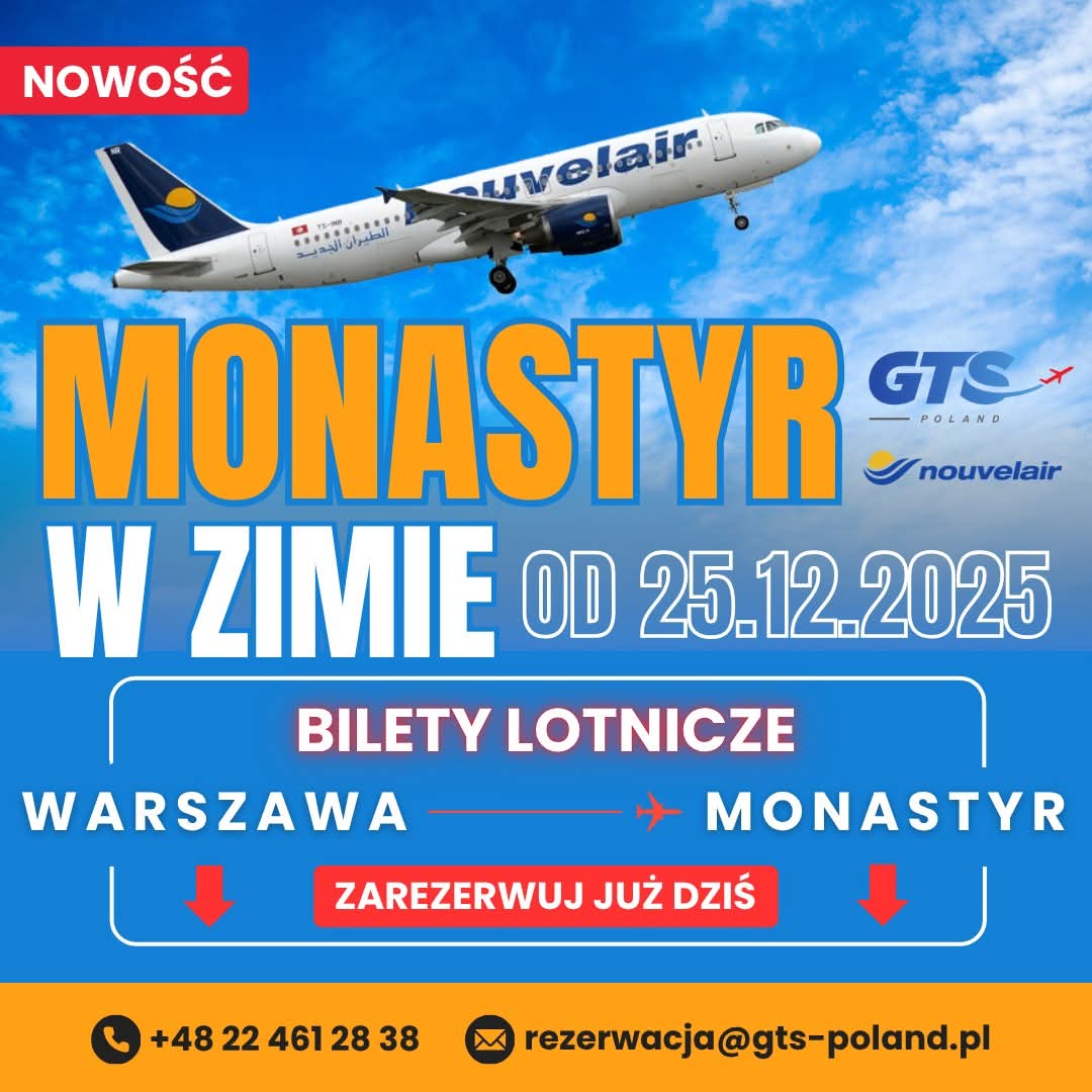 GTS Poland poszerza ofertę czarterów do Tunezji i od 25 grudnia 2025 roku uruchamia nowe zimowe połączenie z Warszawy do Monastyru. Nouvelair będzie obsługiwał bezpośrednie loty, które potrwają mniej niż trzy godziny.