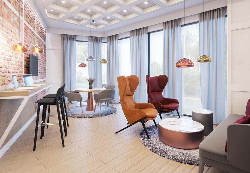 Wnętrza urządzono ze szczególną dbałością o detale, czerpiąc wzorce z architektury miasta.