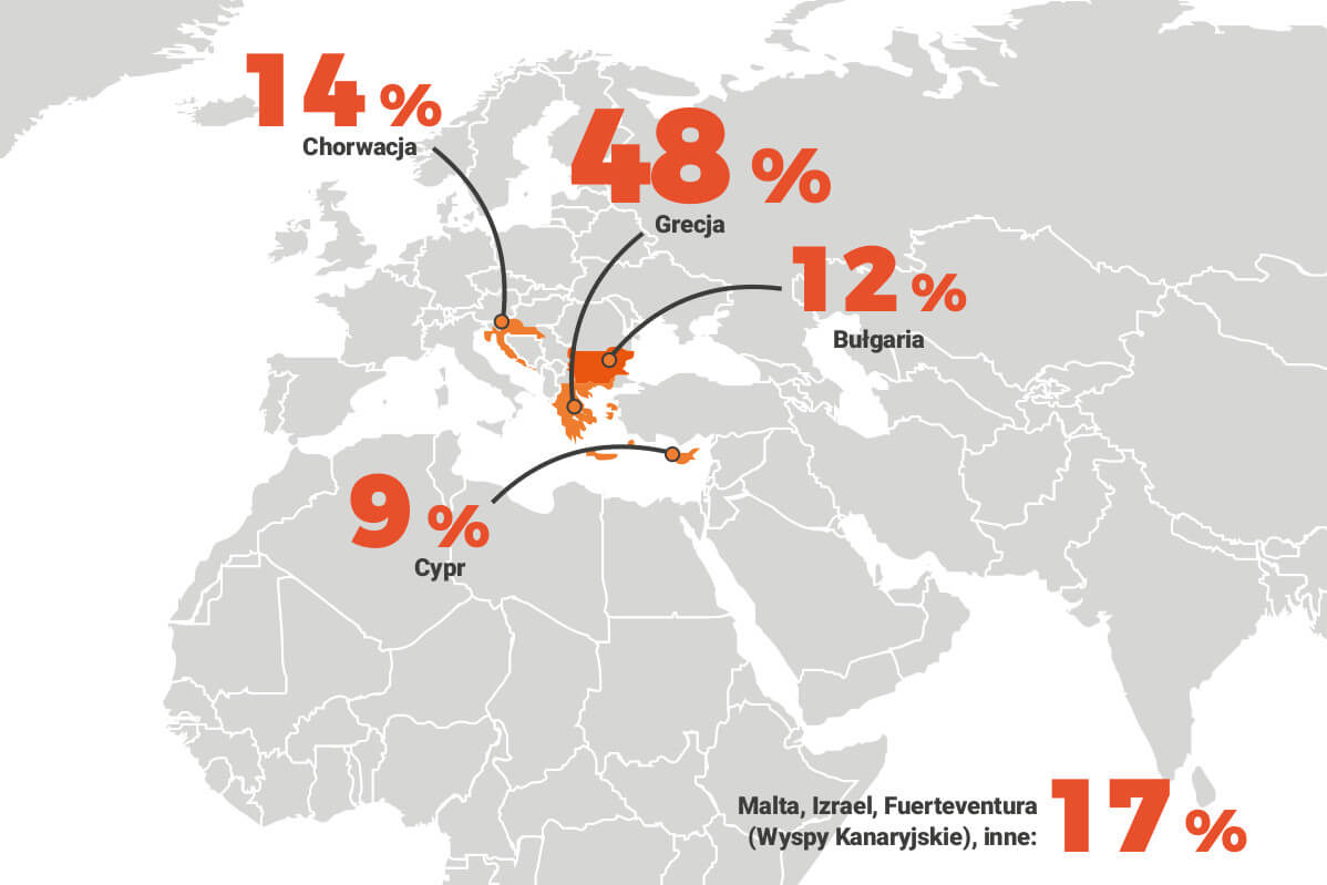 83 proc. wymieniło cztery kraje: Grecję – 48 proc., Chorwację – 14 proc., Bułgarię – 12 proc. i Cypr – 9 proc. 17 proc. wskazało inne kierunki.