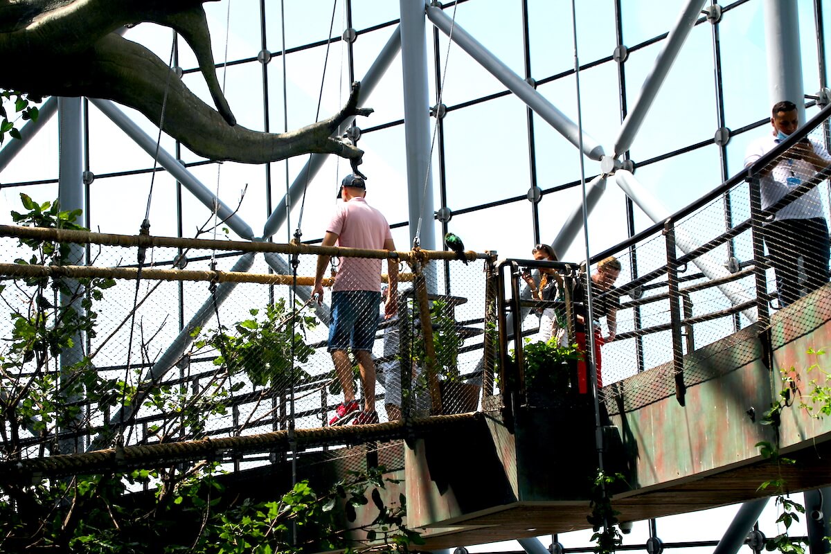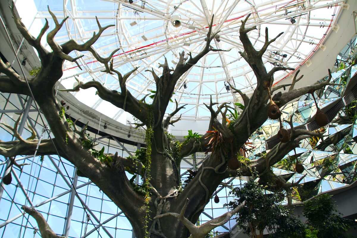 Winda wywozi gości na najwyższą kondygnację, skąd nieśpiesznie schodzimy spiralną pochylnią okrążającą kilkupiętrowej wysokości sztuczne drzewo. Choć samo jest sztuczne, pozwala rosnąć przy sobie najprawdziwszym roślinom wijącym się wokół niego na całej długości. Wśród tej zieleni, w powietrzu o wilgotności 70 proc. i temperaturze ok. 27 stopni Celsjusza fruwają i skaczą ptaki i zwierzęta, które czują się tutaj jak w domu.