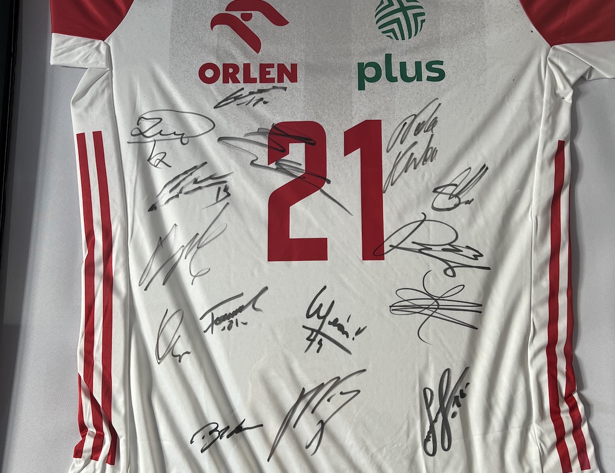 Na koszulce znajdują się podpisy Mistrzów Europy w Piłce Siatkowej Mężczyzn 2023: Bednorza, Fornala, Hubera, Janusza, Kłosa, Kaczmarka, Kochanowskiego, Kurka, Leona, Łomacza, Popiwczaka, Semeniuka, Śliwkę i Zatorskiego.