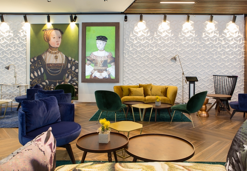 Goście stąpają w lobby po posadzce, której motyw jest współczesną interpretacją wzorów podłóg na Wawelu. Z kolei wchodząc na dywan przy Brand Wall mają pod stopami witraż z gotyckiej rozety.