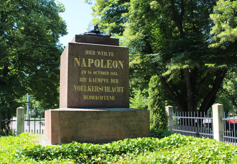 Jest to granitowy blok z napisami: Z tego miejsca 18 października 1813 roku Napoleon obserwował pole bitwy i Miejsce dawnego młynu tytoniowego Quandta, punkt dowodzenia Napoleona. Monument zwieńczony jest leżącymi: szpadą, słynnym kapeluszem napoleońskim i lunetą. Ogrodzony jest płotem żeliwnym z dwunastoma kolumnami.