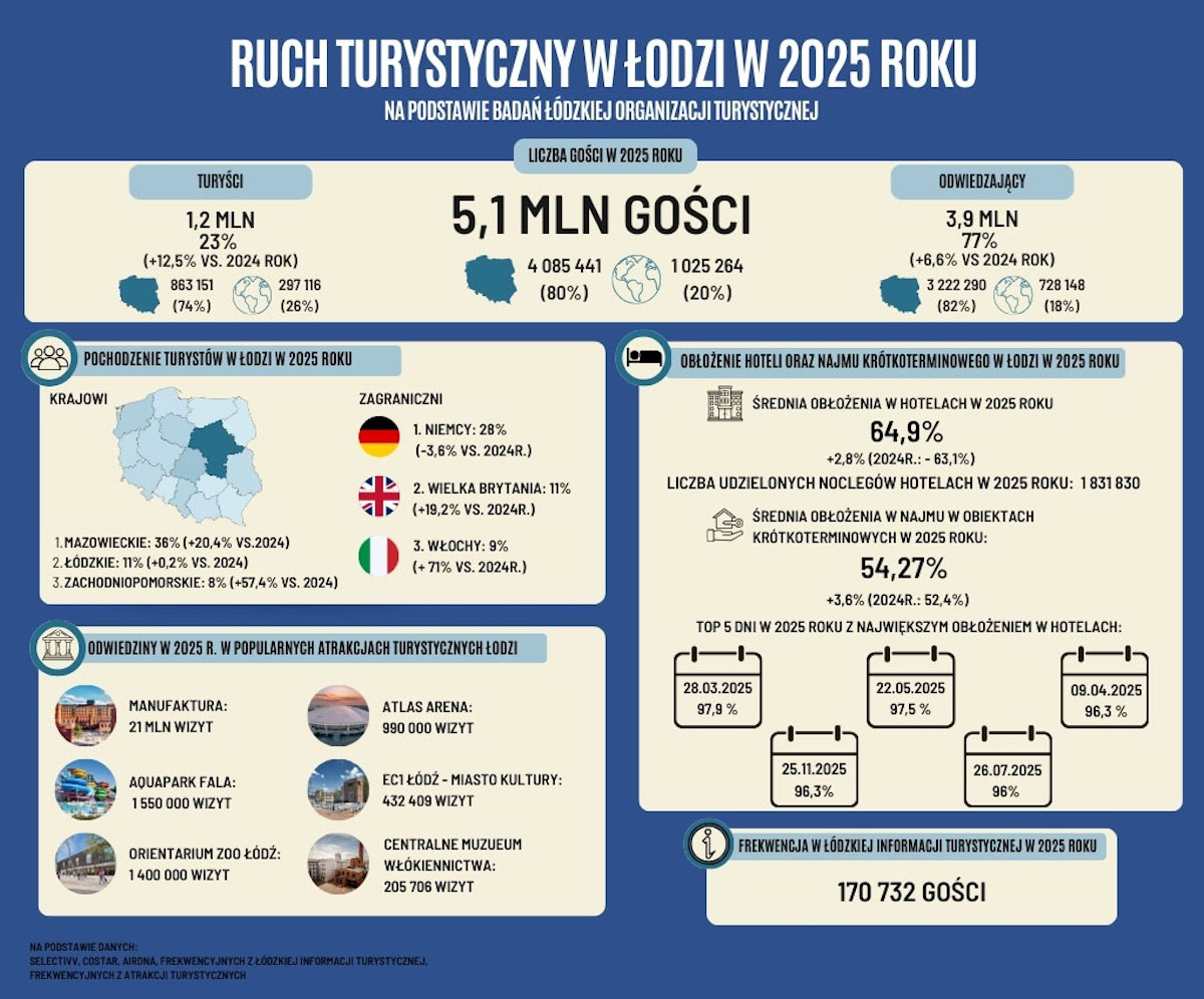 Jak wynika z danych Łódzkiej Organizacji Turystycznej, w 2025 roku Łódź odwiedziło łącznie 5,1 mln gości. Zdecydowaną większość stanowili turyści krajowi, jednak istotny wzrost odnotowano również w segmencie gości zagranicznych oraz turystów korzystających z noclegów. Dane wskazują także na poprawę wyników bazy noclegowej i wysoką frekwencję w najważniejszych atrakcjach miasta.