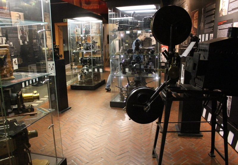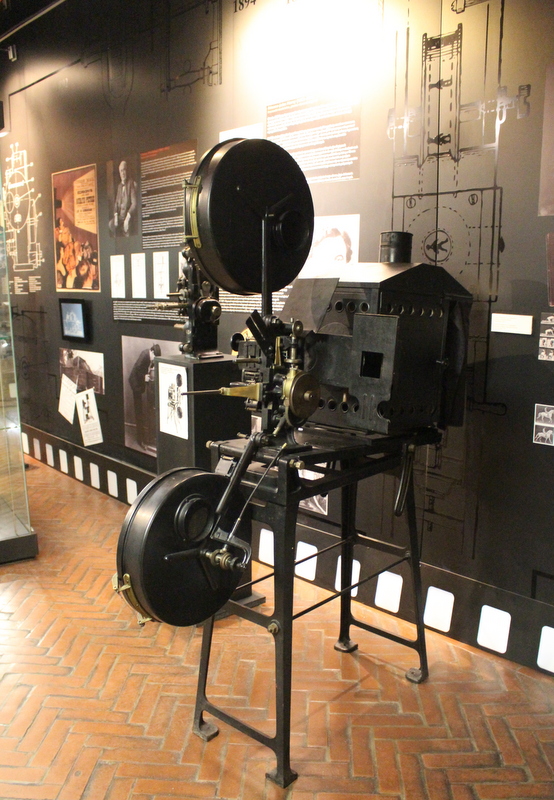 Sama ekspozycja to wycieczka przez historię kinematografii. Możemy więc zobaczyć absolutne początki “kina” – latarnie magiczne z przełomu XIX i XX w., służące do wyświetlania pojedynczych obrazów a także projektor firmy Pathé z początku XX w. oraz słynne pierwsze filmy braci Lumiere. W innym miejscu możemy obejrzeć i skorzystać z fotoplastikonu (jednego z niewielu zachowanych egzemplarzy na świecie).