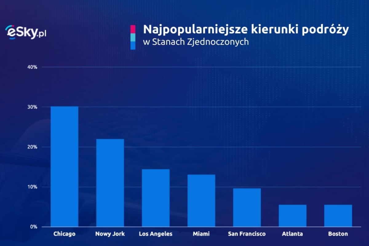 Wśród najpopularniejszych kierunków podróży w USA, na pierwszym miejscu znalazło się Chicago, gdzie znajduje się jedna z największych polskich diaspor. Kolejno w rankingu znajdziemy Nowy Jork, gdzie Polacy najczęściej rezerwują loty do Portu lotniczego Jork-John F. Kennedy oraz do mniejszego lotniska w Newark.