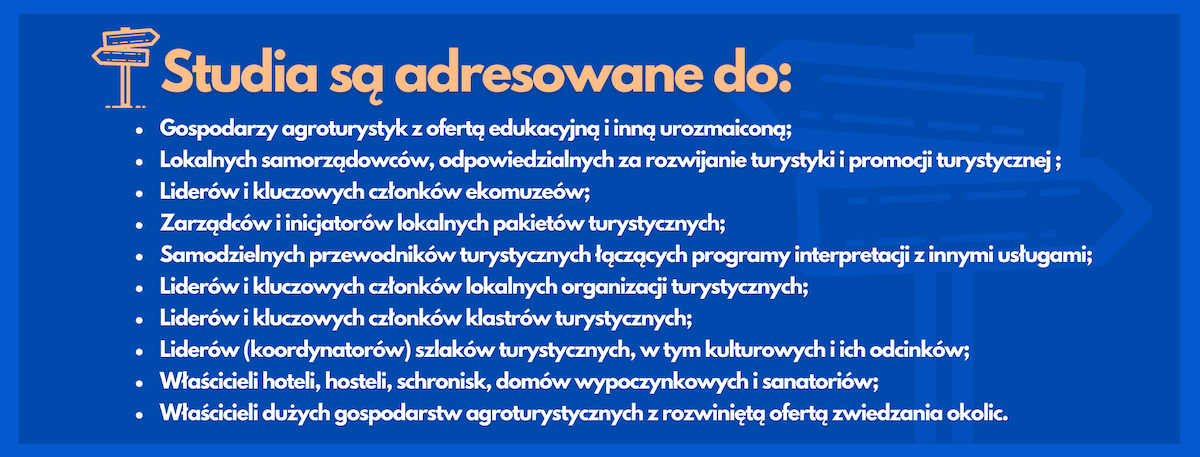 Studia skierowane są dla osób, które pracują w dziedzinie turystyki na co dzień. Praktyczna strona edukacji w GSW Milenium sprawia, że słuchacze będą mogli na bieżąco wykorzystywać zdobytą wiedzę w pracy zawodowej lub w swoim lokalnym biznesie.