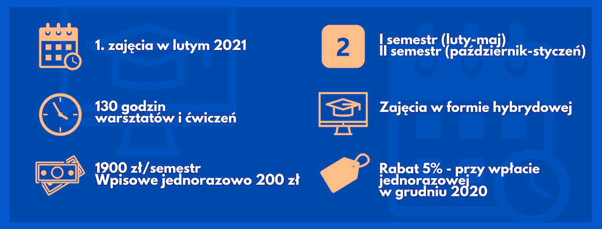 • czas trwania: 2 semestry (luty-maj oraz październik-grudzień) razem 130 godzin wykładów warsztatowych,