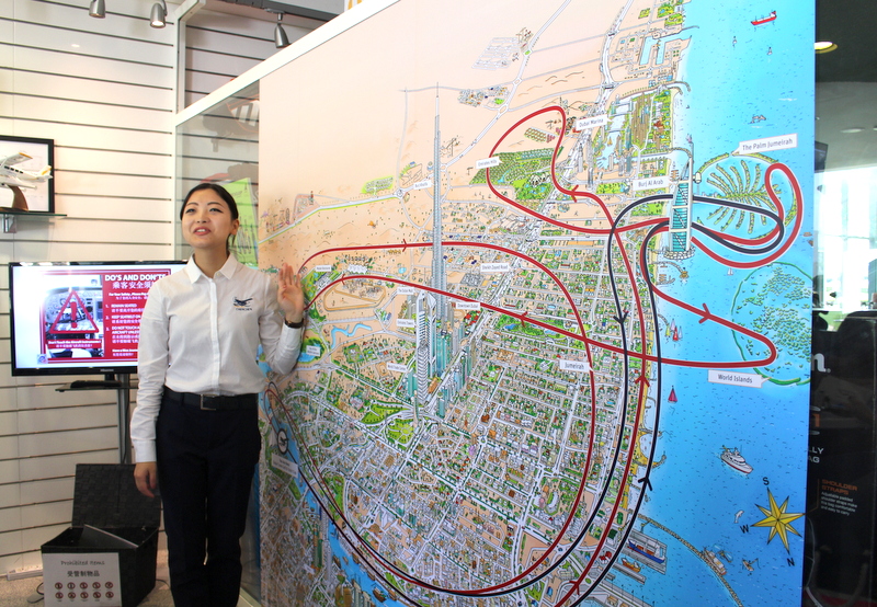 Maszyna robi podwójne pętle wokół najważniejszych miejsc w Dubaju, tak więc pasażerowie siedzący po obu stronach samolotu mają okazję zobaczyć i sfotografować te same miejsca.