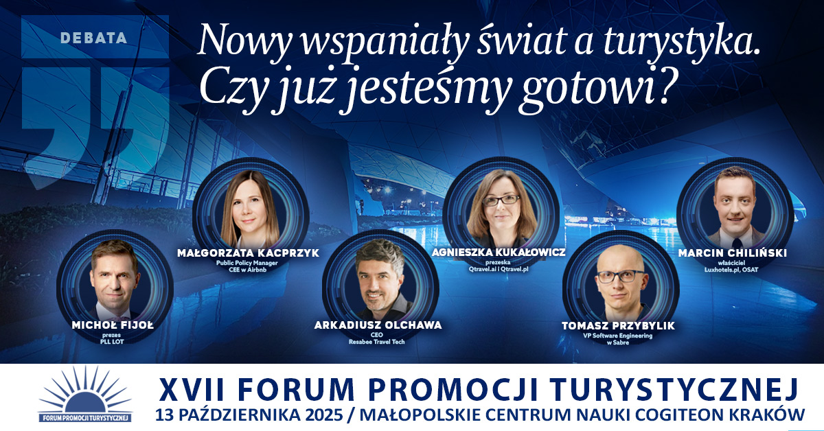 Te i inne tematy wpływu AI na branżę turystyczną będą tematem debaty pt. „Nowy wspaniały świat a turystyka. Czy już jesteśmy gotowi?”, która odbędzie się 13 października w Krakowie w ramach XVII Forum Promocji Turystycznej w Małopolskim Centrum Nauki Cogiteon.