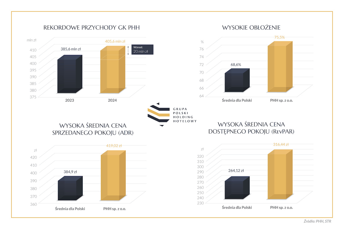 PHH zanotował wyniki operacyjne przewyższające średnie krajowe. Obłożenie pokoi wyniosło 75,5 proc., podczas gdy w skali kraju osiągnęło 68,6 proc. Średnia cena sprzedanego pokoju (ADR) w PHH wyniosła 419,02 zł, czyli o 34,12 zł więcej niż średnia (384,9 zł). Z kolei przychód na dostępny pokój (RevPAR) w PHH osiągnął 316,44 zł, wobec 264,12 zł.