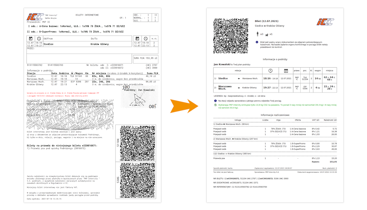 PKP Intercity uwzględniło sugestie klientów i przygotowało bilet, który w czytelny sposób przedstawia wszystkie informacje dotyczące podróży. Szata graficzna biletu została uproszczona – w nowym projekcie wprowadzono: podział na sekcje ze zgrupowanymi informacjami o podróży, pogrubione kluczowe dane dotyczące przejazdu, dzięki którym pasażer łatwiej znajdzie na stacji interesujący go pociąg, a także czytelną tabelę z godzinami odjazdu i przyjazdu. Na bilecie w miejscu kilku kodów QR, znalazł się teraz jeden, który sprawi, że szybciej i sprawniej zeskanuje go drużyna konduktorska. Co więcej ułożenie treści umożliwia nawet 3-krotne złożenie arkusza, nie powodując zagięcia kodu kontrolnego.