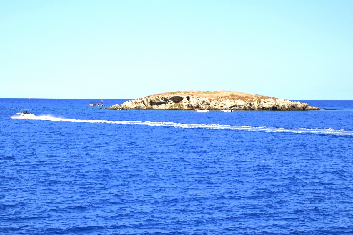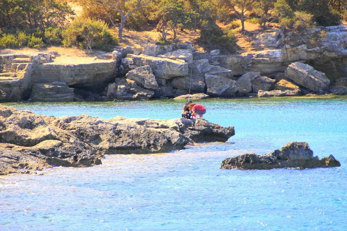 Po środku, rufami do brzegi zakotwiczonych jest kilka innych łodzi. My też rzucamy kotwicę i wreszcie chwila, na którą czekali dorośli I dzieci. Wskakujemy do wody. Temperatura i przejrzystość jak w basenie hotelowym, zero fal. Pluskamy, płyniemy do odległego o sto metrów brzegu, dziecko zbiera kamyki, znowu pluskamy i po godzinie wracamy na łódź. Poczęstunek, obowiązkowe lody dla małej bohaterki i wracamy.