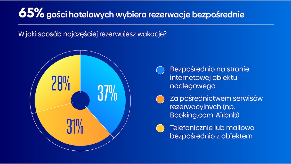 Raport wskazuje na duży wzrost znaczenia direct bookingu – już ok. 2 na 3 badanych decyduje się na rezerwację noclegu poprzez bezpośredni kontakt z obiektem. Podróżujący wybierają różne formy kontaktu – część z nich korzysta ze strony internetowej (37 proc. odpowiedzi), z kolei inni preferują rozmowę telefoniczną lub mail (28 proc.). Przy pomocy zewnętrznych serwisów nocleg rezerwuje 31 proc. respondentów.