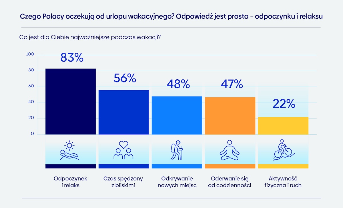 Co poza odpoczynkiem i relaksem? Badani wskazują, że podczas urlopu ważny jest dla nich również czas spędzony z bliskimi (56 proc.), odkrywanie nowych miejsc (48 proc.) oraz oderwanie się od rzeczywistości (47 proc.). Priorytety często wynikają z wieku oraz miejsca zamieszkania turystów. Wyniki badania pokazują, że priorytety wakacyjne Polaków różnią się nie tylko ze względu na wiek, ale i miejsce zamieszkania. Na przykład mieszkańcy największych miast (powyżej 500 tys.) wyżej cenią aktywność fizyczną (27 proc.) niż osoby z terenów wiejskich (19 proc.), podczas gdy mieszkańcy wsi częściej wskazują czas z bliskimi jako kluczowy element wypoczynku.