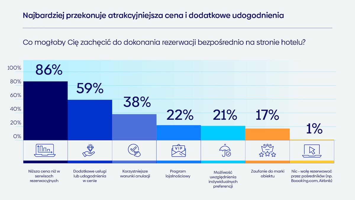 Popularność direct bookingu wynika przede wszystkim z kwestii finansowych. 86 proc. badanych wskazuje, że ceny w bezpośredniej ofercie obiektów noclegowych są głównym motywatorem. Jak jednak podsumowuje Arkadiusz Czerwiński, Rzecznik prasowy Profitroom, czynników motywujących do rezerwacji bezpośrednich jest więcej.