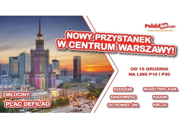 Od 15 grudnia przewoźnik będzie korzystał z nowego przystanku w centrum Warszawy – na Placu Defilad. Autokary kursujące na dwóch trasach: Warszawa – Radom – Ostrowiec Św. –Rzeszów oraz Warszawa – Radom – Skarżysko Kamienna – Kielce będą zatrzymywać się w dwóch nowych, dogodnych lokalizacjach na Dworcu Metro Młociny oraz na Placu Defilad.