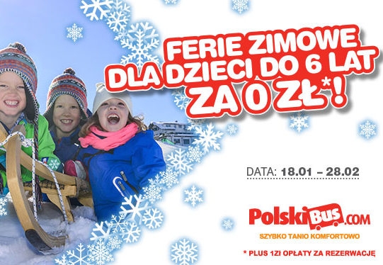 PolskiBus.com wspólnie z PolskiBusGold.com wystartował z promocją przygotowaną dla dzieci na okres ferii zimowych. Od 18 stycznia korzystając z ulgi „Komercyjna: 100% Dziecko do 6 lat” można zakupić dla swojej pociechy bilet za 0 zł. Jedyny koszt to 1 zł opłaty rezerwacyjnej.