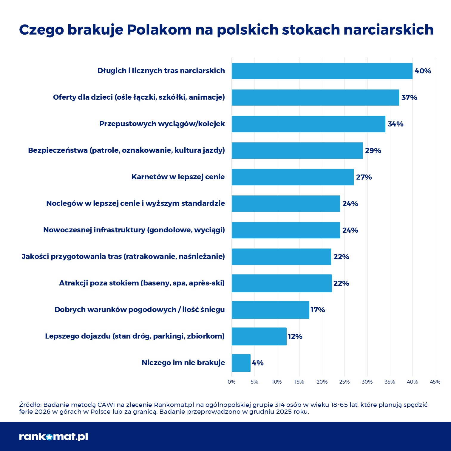 Choć polskie stoki są często wybierane przez narciarzy i snowboardzistów, uczestnicy badania wskazali na szereg obszarów wymagających poprawy. Najczęściej wymieniano brak długich i licznych tras zjazdowych (40 proc.) oraz ograniczoną ofertę dla dzieci (37 proc.). Respondenci zwrócili także uwagę na niewystarczającą przepustowość wyciągów (34 proc.), bezpieczeństwo (29 proc.), ceny karnetów (27 proc.) oraz poziom infrastruktury (24 proc.). Z kolei 4 proc. badanych zadeklarowało, że nie dostrzega braków na polskich stokach.