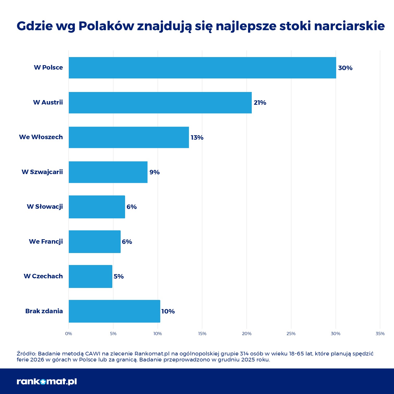 Jednocześnie 60 proc. respondentów wskazało zagraniczne kurorty, przede wszystkim w Austrii (21 proc.), we Włoszech (13 proc.) i w Szwajcarii (9 proc.). Kolejne miejsca zajęły Słowacja i Francja (po 6 proc.). Wśród konkretnych zagranicznych lokalizacji najczęściej wymieniano austriacki Tyrol (8 proc.), włoskie Dolomity (4 proc.) oraz szwajcarskie Valais (2 proc.).