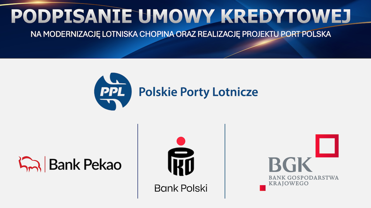 Polskie Porty Lotnicze podpisały umowę kredytową z konsorcjum polskich banków – Bankiem Pekao S.A., PKO Bankiem Polskim oraz Bankiem Gospodarstwa Krajowego. Bank Pekao S.A. pełni rolę agenta kredytu i nadzoruje zabezpieczenia. Pozyskane finansowanie potwierdza zarówno wiarygodność biznesową PPL, jak i akceptację rynku dla przyjętego planu rozwoju. Zakłada on stopniową transformację polskiego lotnictwa – najpierw pełne wykorzystanie potencjału Lotniska Chopina, a następnie przeniesienie części ruchu do nowego, centralnego portu lotniczego.