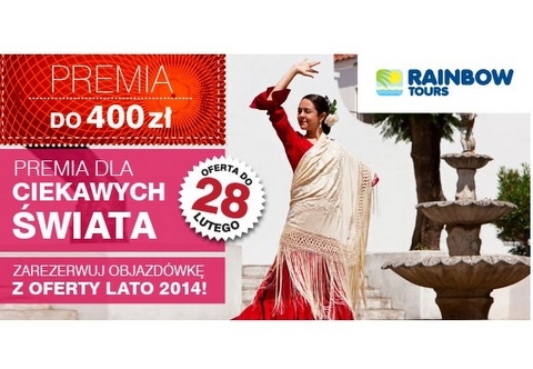 W nowej promocji, będącej częścią oferty Lato 2014, a każdą zakupioną do 28 lutego wycieczkę objazdową lub objazdowo – pobytową klient otrzymuje do 400 zł premii na kolejne, dowolne wakacje z Rainbow Tours.