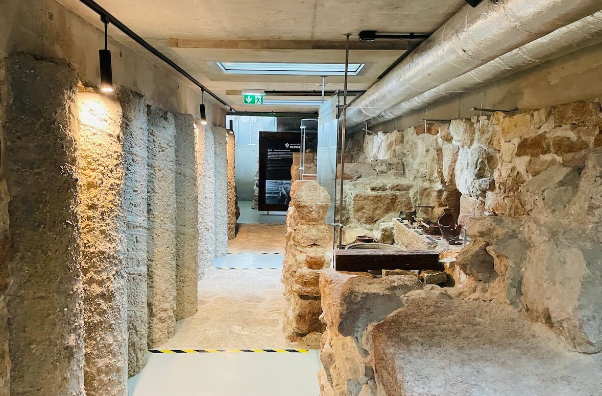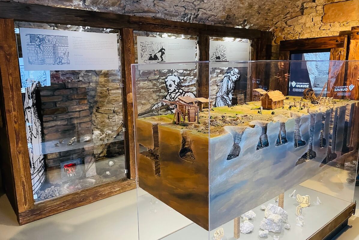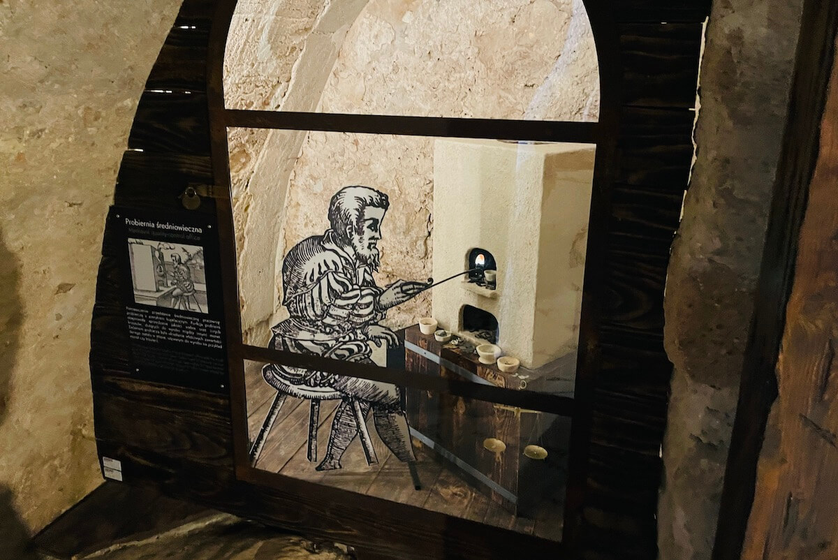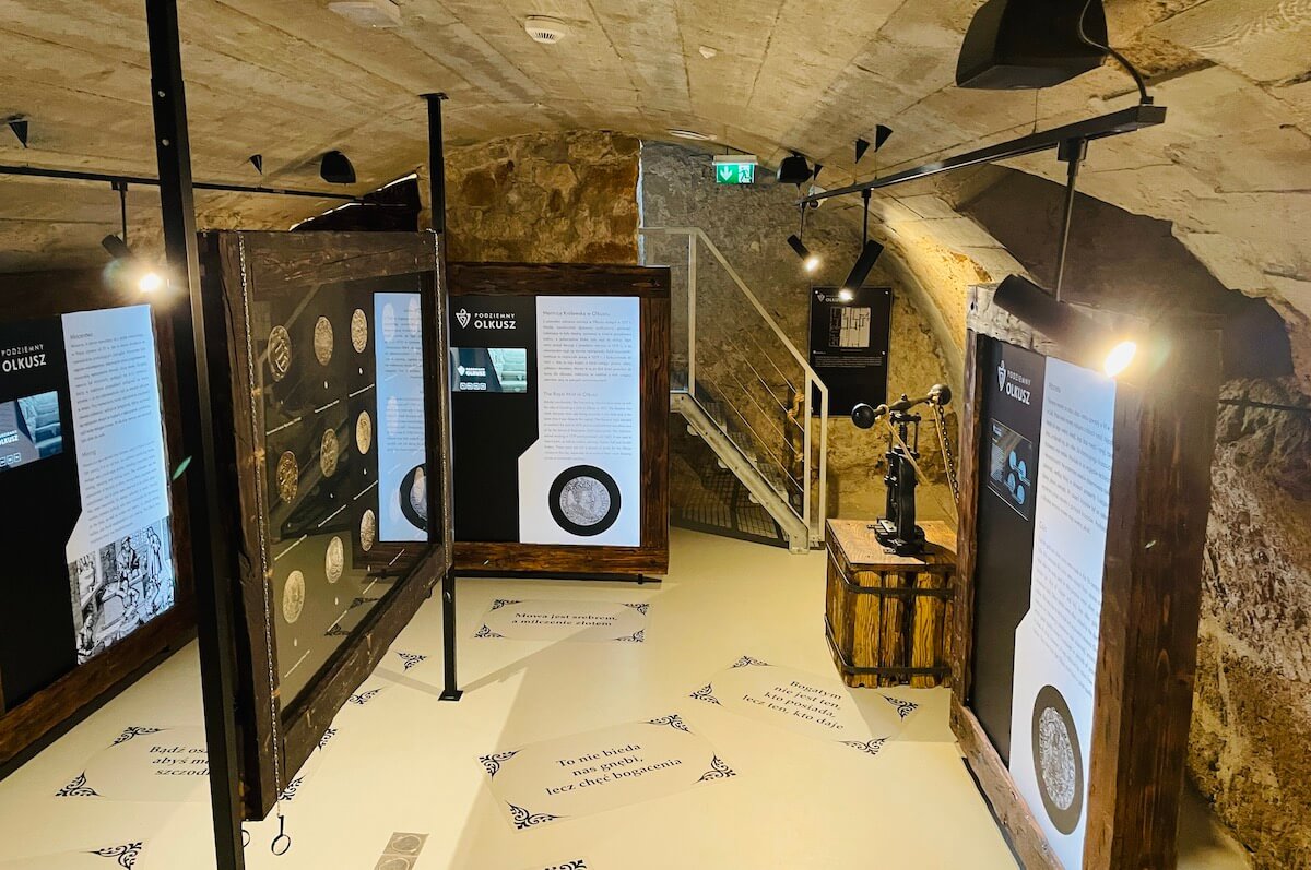 Piwnice, do których wejście znajduje się we wspomnianym budynku, to pozostałości domów i piwnic budowanych w stylu gotyckim. W salach i korytarzach utworzono ekspozycję multimedialną ukazująca historię olkuskich górników a także tutejszej mennicy. W jednej z komór postawiono prasę menniczą, na której można wybić replikę małej monety – trojaka olkuskiego.